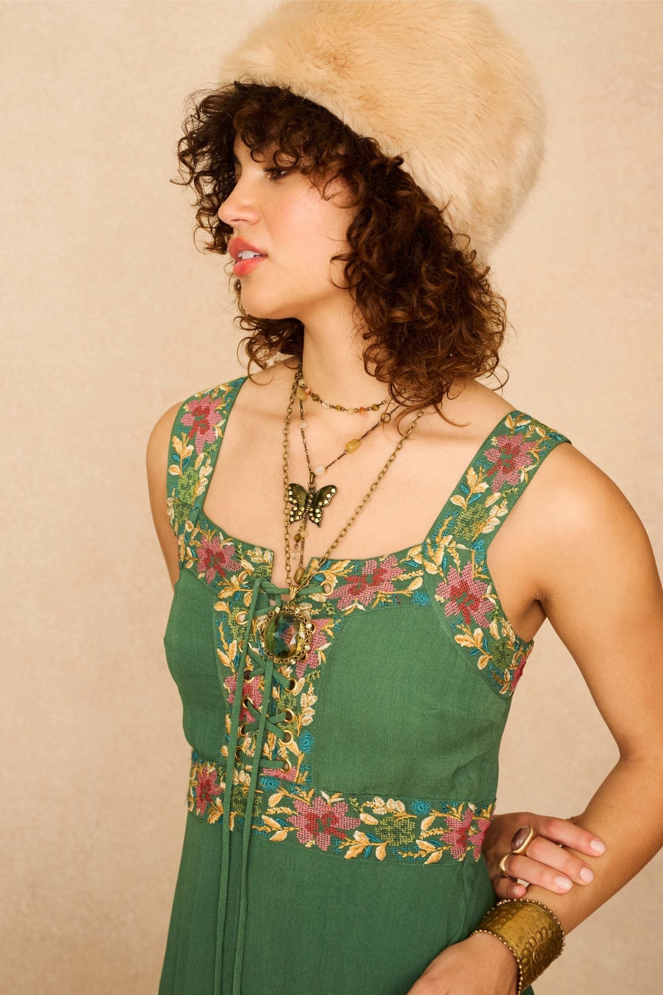 The Forest Belle Green Floral Trim Midi Dress is a little slice of woodland magic. With an embroidered cotton floral trim across the bodice, lace-up front with brass eyelets, and a hanky hem skirt that moves like a breeze through the trees, this piece is all about ethereal elegance with a folk-rock edge.