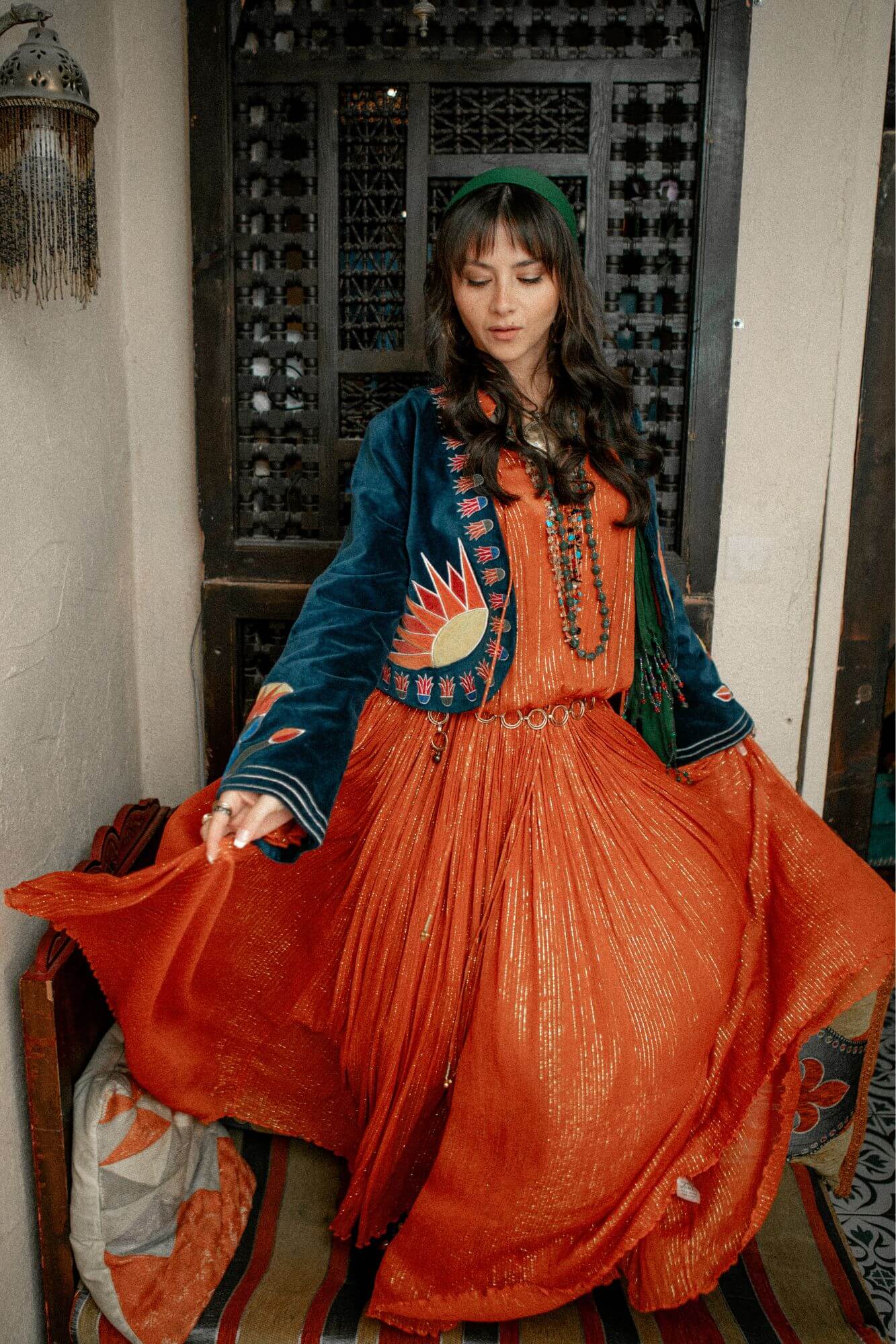 It’s the perfect piece for when you want to feel a little special, whether layered under our Zodiac Blue Velvet Embroidered Jacket or worn with the Stardust Brown Corduroy Vest for a more grounded, textured look. The colour catches every bit of light and the movement is pure poetry in motion.