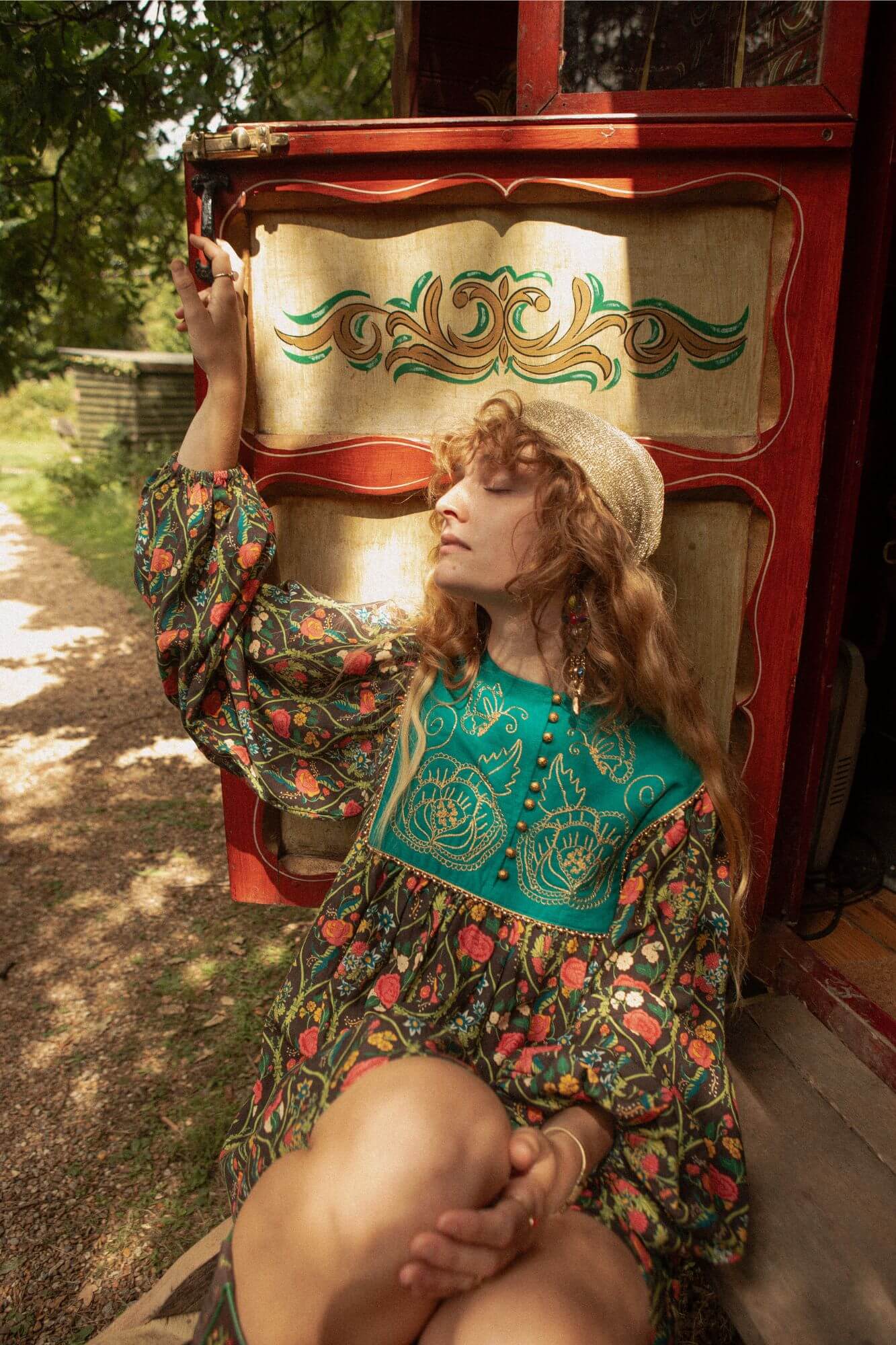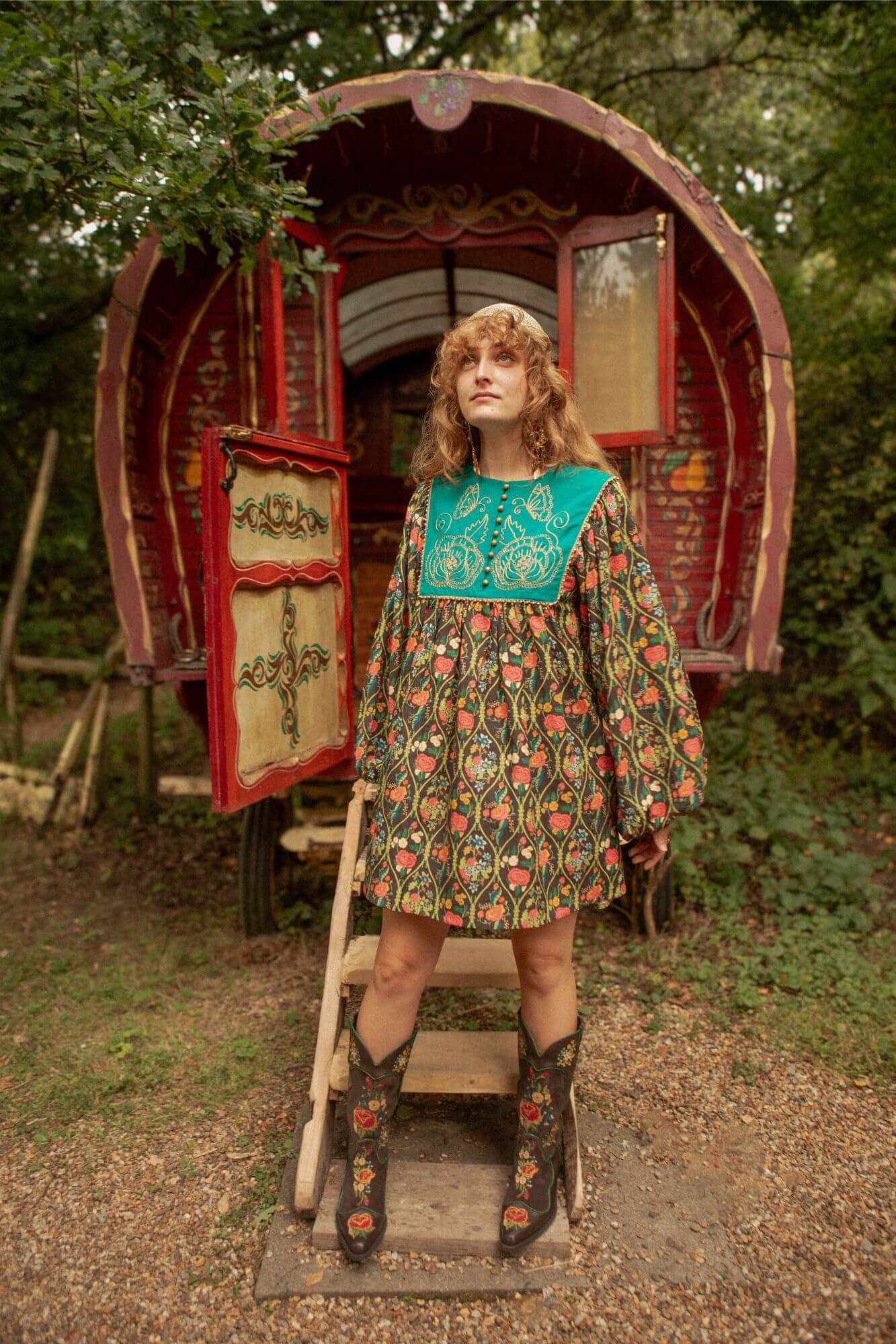 Let your wardrobe weave a little spell with the Some Kind of Magic Embroidered Mini Dress – a jewel-toned vision with a teal yoke waistcoat, hand-finished in golden ari embroidery across the chest and back, and framed with matching buttons and trim. The flowing skirt blooms with our floral vine print, while voluminous balloon sleeves gather softly at the cuffs for a touch of drama. Made from a textured cotton–viscose blend, it’s a piece that carries you gracefully from warm autumn afternoons to candlelit evenings.